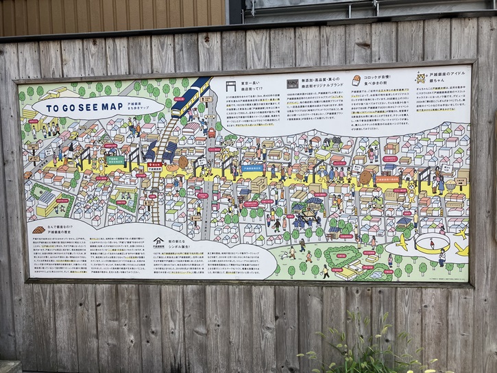 駅前に、戸越銀座のウンチクを記した案内板が立っています。