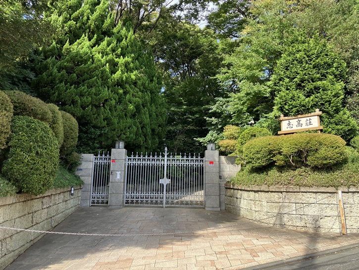 品川区と大田区の区界に「志高荘」という看板が見えます。志高荘は、大同燐寸製造・満洲重工業開発・日本コロンビア蓄音器・日産などの重役を歴任した三保幹太郎氏が昭和十六年(1941年)に建てた和風2階建ての私邸として誕生しました。その後、昭和二十八年(1953年)に東芝に譲渡され、東芝が政財界要人を接待する目的で所有した東芝迎賓館「東芝会館」となり、平成三十年(2018年)にニトリグループが所有する迎賓館の「志高荘」になりました。約六千平方メートルの広大な庭園内には、大森八景園旧在と伝わる茶室「雪庵」もあり、庭園の池には色とりどりの鯉が優雅に泳いでいます。