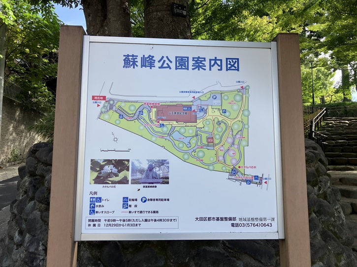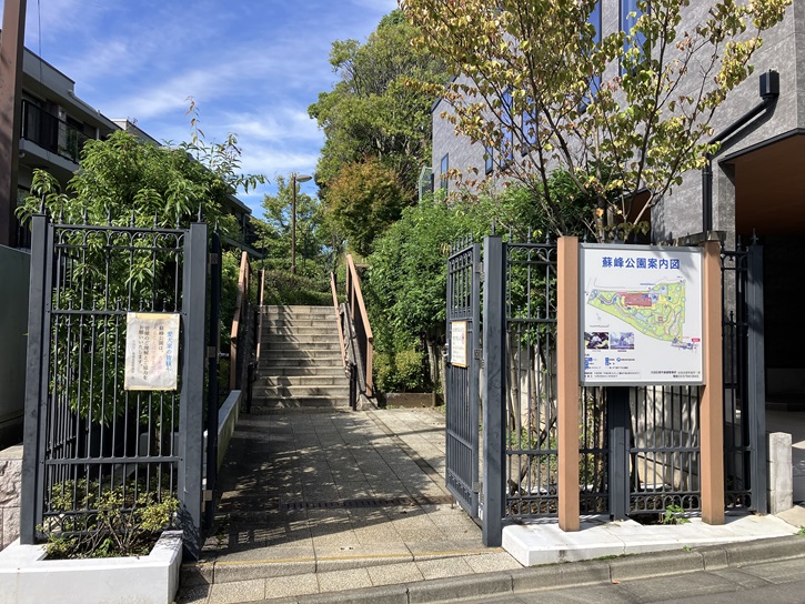 志高荘のすぐ先に、蘇峰公園があります。ここはもう大田区になります。蘇峰公園は、徳富蘇峰の居宅跡(山王草堂)を公園にしたものです。入口には高くそびえる2本のイチョウの木があり、公園の目印になっています。