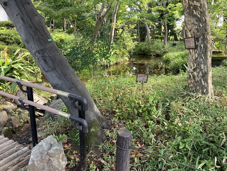 庭園は植え込み・梅林・流れと池などで構成され、落ち着いた雰囲気があります。園内にはイチョウ・マツ・クヌギ・ウメ・カタルパ・アジサイなどの樹木や花が見られます。