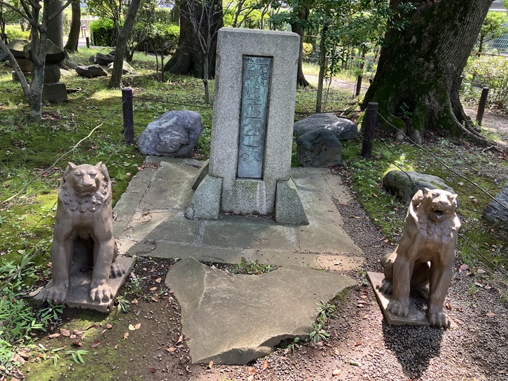 池の畔に石碑が建っています。この石碑は台座に当る部分で、その上に置かれていた銅像は戦時中の金属類回収令より、国に供出されたのだそうです。