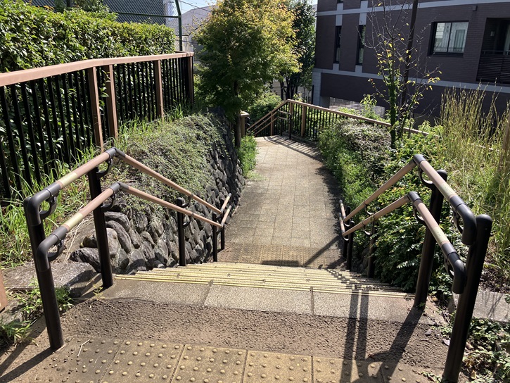 公園は入口が狭く、奥は広くなった台形のような形状をしていて、谷底に位置する入口から階段を上がって園内に入っていく感じです。