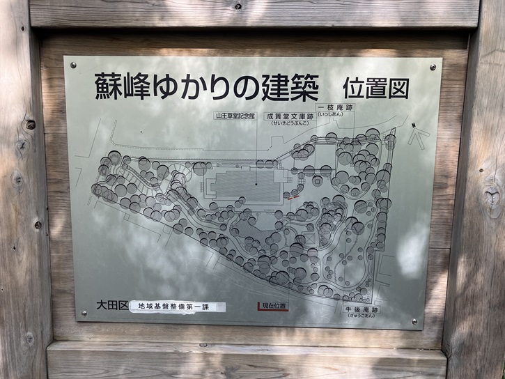 徳富蘇峰(1863年〜1957年)は大正十三年(1924年)、この地に居宅を建て、山王草堂と称して昭和十八年(1943年)熱海伊豆山に移るまでここに起居した。邸内には母屋の他に三つの建築が建っていたことが知られており、それぞれ成簣堂文庫(せいきどうぶんこ)、一枝庵(いっしあん)、牛後庵(ぎゅうごあん)と名付けられていた。それら蘇峰ゆかりの建築について記す。