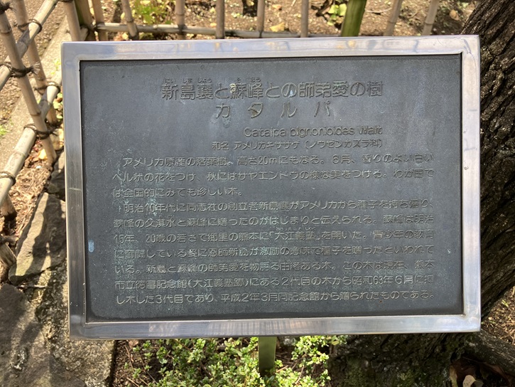 カタルパの樹(日本名:アメリカキササゲ)は、同志社の創設者である新島襄がアメリカから持ち帰ったもので、徳富蘇峰にその苗が譲られ、大江義塾(熊本市)に植えられました。大江義塾で蘇峰と平田一十は師弟関係にありましたが、のちに一十が地元の黒松に合志義塾を開いたことを聞きつけ、蘇峰はその苗を合志義塾にも譲り渡しました。カタルパの樹は「文教の地・合志」の象徴として、合志義塾より株分けされた苗が合志市内の全小中学校にも植樹されました。毎年5月になると白い花を咲かせます。このカタルパの樹は、「カタルパの小径」が開通した記念に植えられたものです。ちなみに、園内の山王草堂記念館の入口脇にもカタルパの樹が聳えていますが、そちらは新島襄から徳富蘇峰に贈られた樹の三代目に当るそうです。