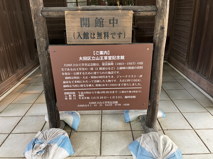 大田区立山王草堂記念館は、徳富蘇峰(1863年〜1957年)の旧宅である山王草堂の一部(2階部分など)と蘇峰の関連の資料を保存・公開するために建てられた施設です。蘇峰は明治・大正・昭和の時代を生き、ジャーナリスト・評論家など多岐にわたって活躍した人物です。大正十三年(1924年)、蘇峰は当所に邸宅を構え、昭和十八年(1943年)まで暮らしました。
