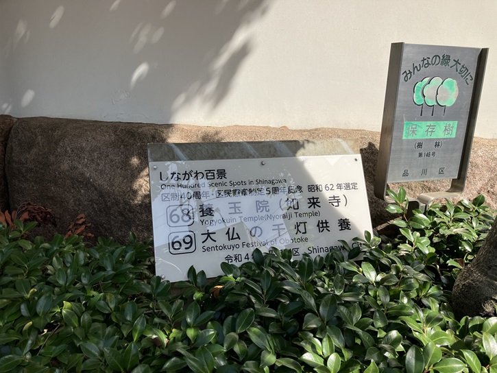 ちなみに、しながわ百景には、「68 養玉院(如来寺)」という名前で登録されています。併記されている「69 大仏の千灯供養」とは、迎え盆の8月13日に境内に設置された1000個の堤灯に次々と火が灯され、幽玄な情趣を醸し出す供養の行事のことです。