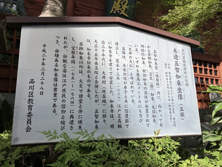 木造の仏像としては都内最大級の3メートル超の五智如来は高輪の大仏と呼ばれ、江戸有数の名作として評判となりました。薬師如来を除いて他の4体は享保十年(1725年)と延享二年(1745年)の火災で焼失しましたが、延享三年(1746年)頃に再興されました。現在は大井の大仏として親しまれています。