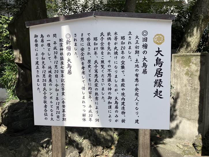 大正初期、土地の有志が発起人となり、建立されました。昭和二十年の空襲で、本殿や境内建造物、樹木等が丸焼けになりましたが、大鳥居のみが戦禍を免れ、その不思議な神の御加護により氏子全体をご照覧くださいました。昭和四十九年、氏子篤志氏家の熱意により、銅で修復され、歴史とともに約百年、平成三十年8月に安全性を考慮して、惜しまれつつ解体されました。