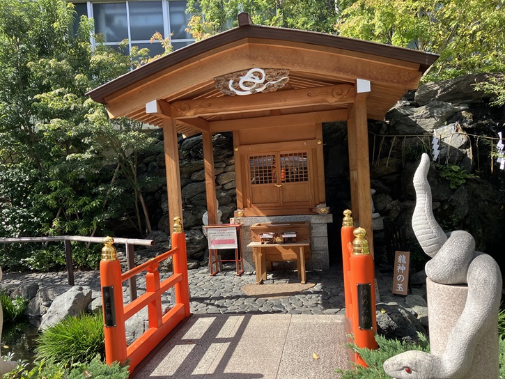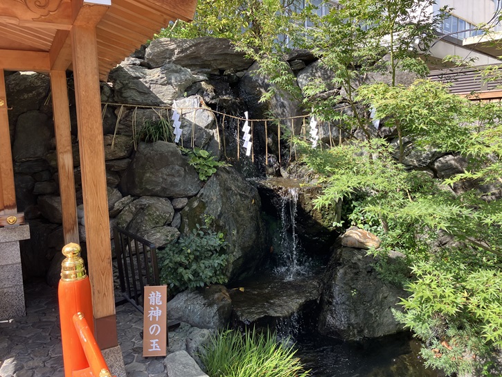 白蛇辨財天の脇には「白龍の滝」と呼ばれる滝があり、そこから流れ出た水路には「夢巳橋」が架かっています。