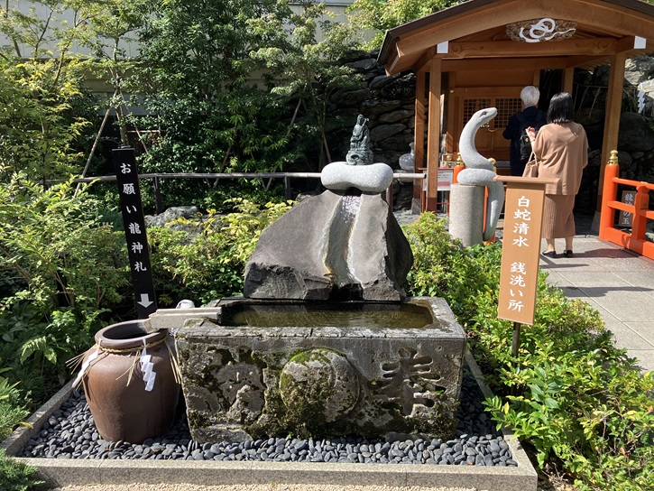 白蛇辨財天の前には「銭洗い所」があります。これらの施設は、鎮座七百年を記念して令和三年4月1日に建替え・新設されました。