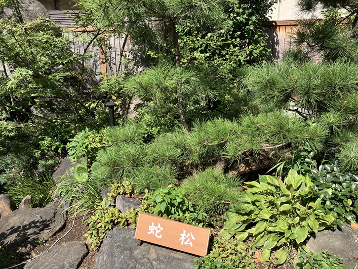 白龍の滝の横には、「蛇松」が植えられています。松葉が繁っていてよく見えませんが、松の木の枝が絡みあって蛇のような恰好をしています。