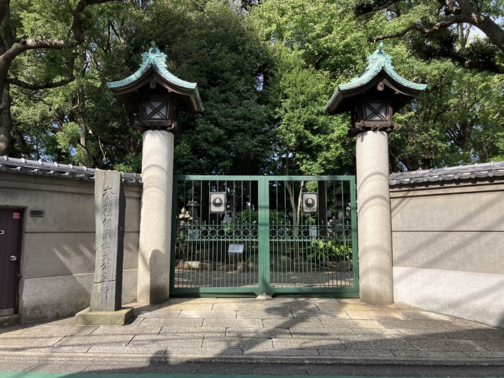 上神明天祖神社から立会道路を通って西大井駅に向かいます。途中で右折してクランク状に曲がった先に、立派な門構えの伊藤博文公墓所があります。伊藤博文(1841年〜1909年)は長州藩の下級武士の子として生まれ、幕末期に高杉晋作らと倒幕運動に参加しました。明治維新後は初代内閣総理大臣を務め、明治四十二年にハルビンで暗殺されて国葬が行なわれた後、大井に居館があったことからこの地に葬られました。伊藤門と呼ばれる門柱と門扉は、昭和二十五年に伊藤博文公宅から譲り受けたものです。門柱には、「大勲位伊藤博文公墓所」と刻まれています。