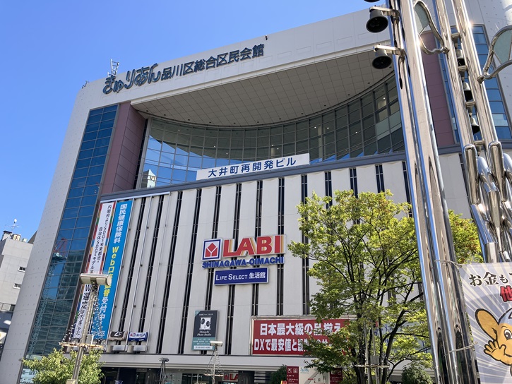 東口駅前は高架の広場になっていて、正面と右手に巨大なLABIヤマダデンキのツインビルが聳えています。ちなみに、LABIとは造語の「LIFE ABILITY SUPPLY」の略語です。右手ビルの脇から階段を下りると立会道路が通っています。といっても、右手は京浜東北線の駅ホームに突き当たって行き止まりになっています。大井町駅が出来る前は、立会川は現在駅ホームが建っているところを横切るように流れていたのでしょう。