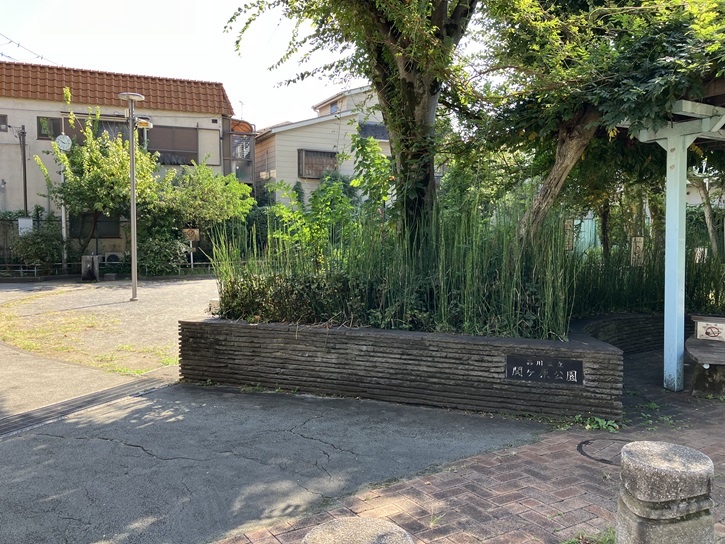 遊歩道の中ほどに小さな公園があります。「関ヶ原公園」という名称ですが、これは昔の地名が「関ヶ原」だったことに由来しています。JR線の敷地を含むこの辺り一帯は江戸時代には島津家の屋敷だったそうです。