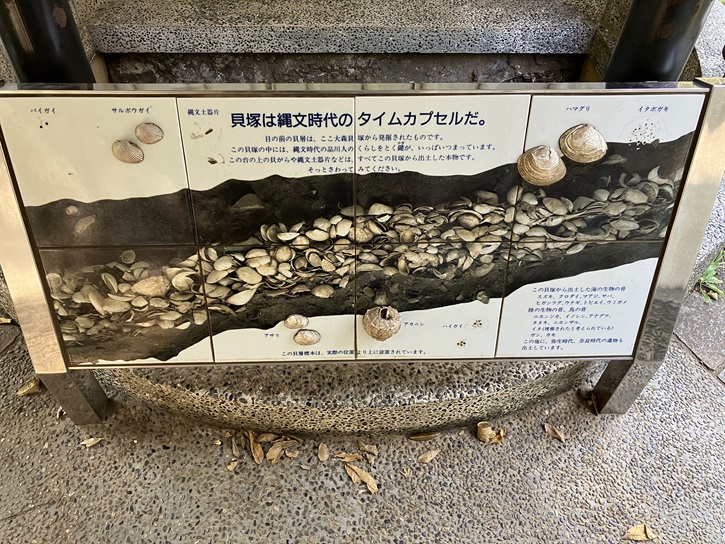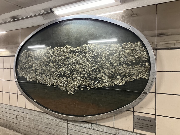 桐畑地下道の壁面には、大森貝塚の貝層を復元した模型が飾られています。