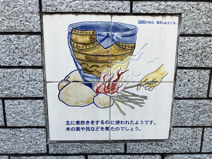 出土した土器類の用途を推測した絵入りのタイルも貼られています。お茶が中国から伝来したのは奈良時代のことですから、急須はお酒を注ぐために使用されていたに違いありません。