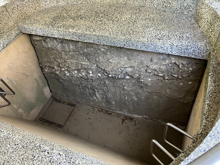 水琴窟とは、小さな洞窟に水滴を落とし、かめの中で反響する水音を楽しむもので、その歴史は江戸時代まで遡ると言われています。水琴窟は安田善助邸の時代からありましたが、長らく忘れられていました。昭和五十五年(1980年)、品川歴史館建設に際して調査したところ、庭の片隅に落ち葉や土に埋もれた常滑焼の水琴窟が発見されました。その後「幻の水琴窟」として紹介され、その魅力を再び世間に知らせることになりました。今でも、きれいな音色を奏でて品川歴史館庭園の「主役」となっています。水琴窟の穴の周りに水を滴らして、竹筒を耳にあてて優雅な水滴音の響きを聴いてみましょう。
