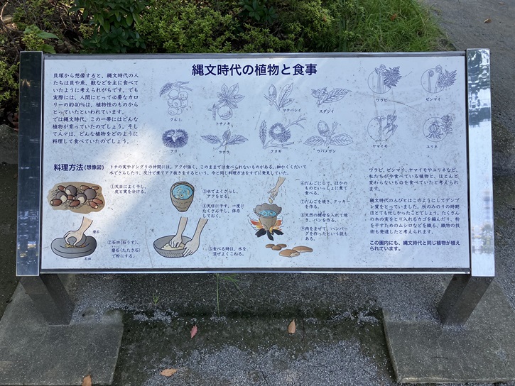 「貝塚学習広場」は、当時の縄文人の暮らしぶりや生活環境が学習できる広場です。パネルには、縄文時代の生活が挿絵付きで解説されています。先ずは生存に不可欠な食べ物の種類と調理方法です。