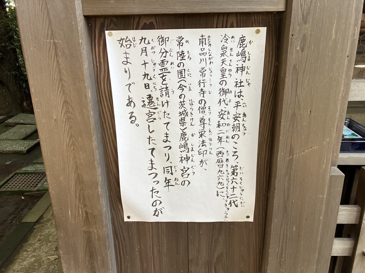 御祭神は武甕槌之神。御創建は平安期の安和二年(969年)に常陸の国、鹿島神宮の御分霊を当地に勧請したのが始まりです。