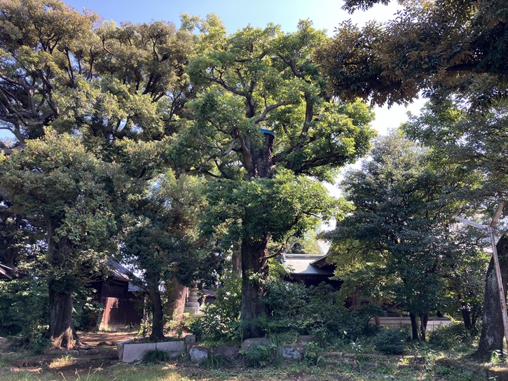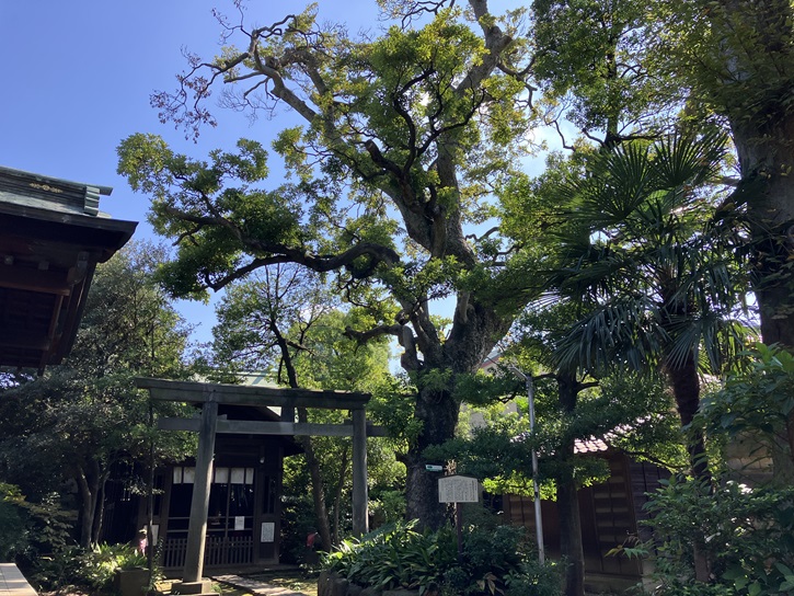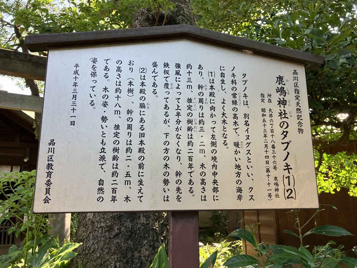 広々とした境内は多くの樹木に覆われ、特に大きな推定樹齢200年のタブノキ2本と樹齢200年以上のアカガシは品川区の天然記念物になっています。本殿前のタブノキ(1)は強風によって上半分がなくなり、幹の先が鉄板で覆われています。