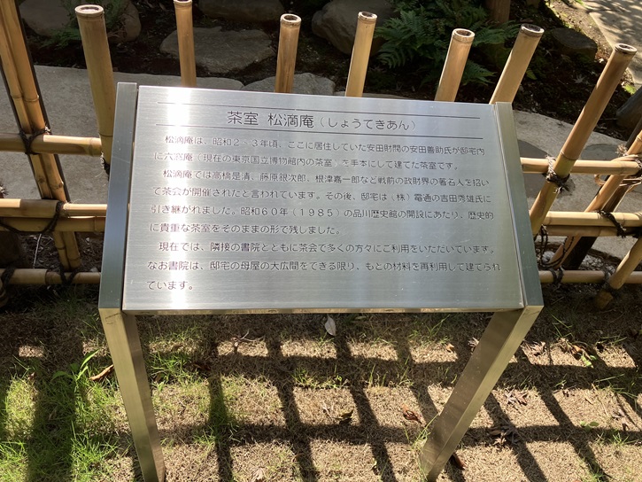 松滴庵は、昭和二〜三年頃、ここに居住していた安田財閥の安田善助氏が邸宅内に六窓庵(現在の東京国立博物館内の茶室)を手本にして建てた茶室です。松滴庵では高橋是清、藤原銀次郎、根津嘉一郎など戦前の政財界の著名人を招いて茶会が開催されたと言われています。その後、邸宅は(株)電通の吉田秀雄氏に引き継がれました。昭和六十年(1985年)の品川歴史館の開設にあたり、歴史的に貴重な茶室をそのままの形で残しました。現在では、隣接の書院とともに茶会で多くの方々にご利用をいただいています。なお書院は、邸宅の母屋の大広間をできる限り、もとの材料を再利用して建てられています。