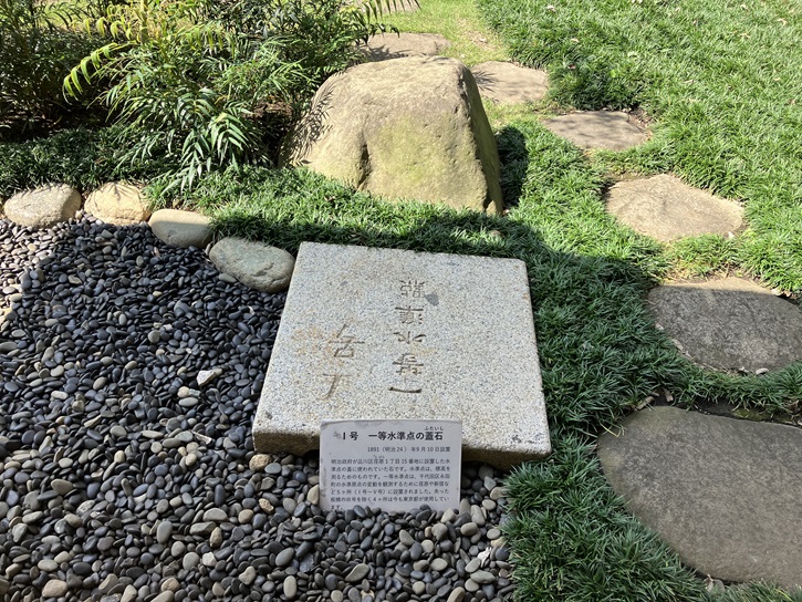 庭園の中に水準点の蓋石が残されています。
