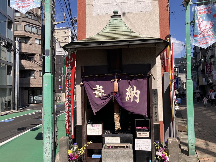 商店街の入口に小さな地蔵尊の祠が建っています。古道の分岐点に当たるこの地に、昔十一面観音を祀った堂があった、あるいは直ぐ近くの庚申堂付近から出土した地蔵を祀ったといわれています。