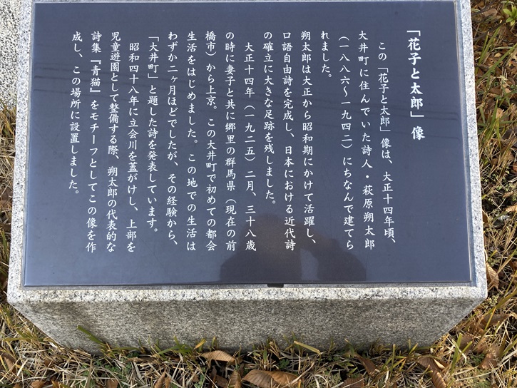 この「花子と太郎」像は、大正十四年頃、大井町に住んでいた詩人・萩原朔太郎(1886年〜1942年)にちなんで建てられました。朔太郎は大正から昭和期にかけて活躍し、口語自由詩を完成し、日本における近代詩の確立に大きな足跡を残しました。大正十四年(1925年)二月、三十八歳の時に妻子と共に郷里の群馬県(現在の前橋市)から上京。この大井町で初めての都会生活をはじめました。この地での生活はわずか二ヶ月ほどでしたが、その経験から、「大井町」と題した詩を発表しています。昭和四十八年に立会川を蓋がけし、上部を児童遊園として整備する際、朔太郎の代表的な詩集「青猫」をモチーフとしてこの像を作成し、この場所に設置しました。
