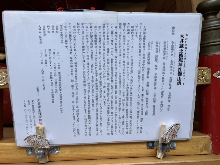 大井蔵王権現神社は十世紀(平安時代)に現在のJR東日本工場である権現台に鎮座し一郷の鎮守として住民の信仰を集めています。起源は定かではなく、大井一郷では「権現様」として親しまれています。明治四十三年(1910年)権現台を造成し、現在の品川操車場埋め立て工事の際、東大井の来福寺に移遷し、大正十四年(1925年)十月三日、日本理化工業株式会社の御好意により社有地に遷座されるに至りました。現在の神社は昭和六十三年五月に氏子一同により新しく竣工遷座しました。遷座二十周年にあたる平成二十年と、十年後の遷座三十周年に神幸祭を賑々しく執り行いました。蔵王権現は六世紀後半、役小角行者の開祖より奈良県吉野山の金峯山寺に本尊としてお祀りしている「蔵王大権現」であり、神社の起源は開祖様のお弟子により山岳信仰の拠点として当社を創建したと思われます。神社の主祭神の金山毘古命、金山毘売命は吉野の大峯山麓の金峯山神社に、建速須佐男命は出雲大社にお祀りされている神として親しまれています。現在神社奥殿に残されている石堂は「蔵王大権現」寛政五年(1793年)と刻まれています。神社宮御輿胴部分には「太平記」に登場する吉野南朝の後醍醐天皇と天皇を守護した楠正成・正行親子の絵巻が唐絵(極彩色)で描かれ、東京では大変珍しいお御輿です。大正十四年十月三日この地に遷座することに尽力された名和長憲男爵は後醍醐天皇に縁の名和家の子孫に当たり権現神社と縁のある奈良県吉野山に関係すると思われます。社紋は吉野ゆかりの桜紋です。境内のお堂に祀られている「福禄寿尊向拝宮」は平成三年に発足した「荏原七福神」の「福禄寿」です。南極星人とよばれ、現世の福(幸せ)、禄(出世・財運)、寿(長命)を授けていただけるありがたい福の神です。
