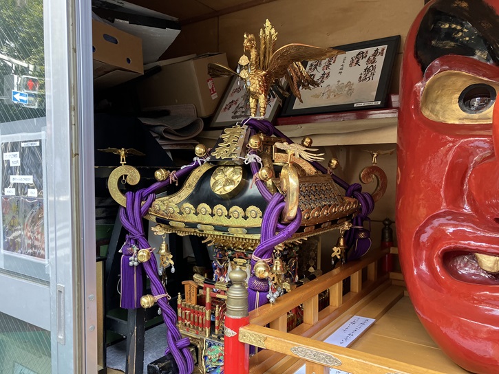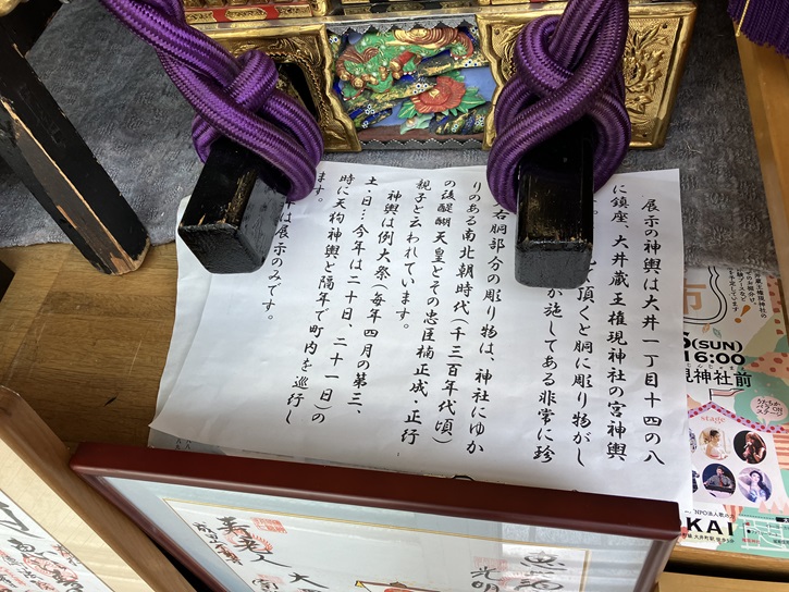 展示の神輿は大井一丁目十四の八に鎮座、大井蔵王権現神社の宮神輿です。よく見て頂くと胴に彫り物がしてあり、極彩色が施してある非常に珍しい神輿です。??右胴部分の彫り物は、神社にゆかりのある南北朝時代(千三百年代頃)の後醍醐天皇とその忠臣楠木正成・正行親子と云われています。神輿は例大祭(毎年四月の第三、土・日・・・今年は二十日、二十一日)の時に天狗神輿と隔年で町内を巡行します。??年は展示のみです。