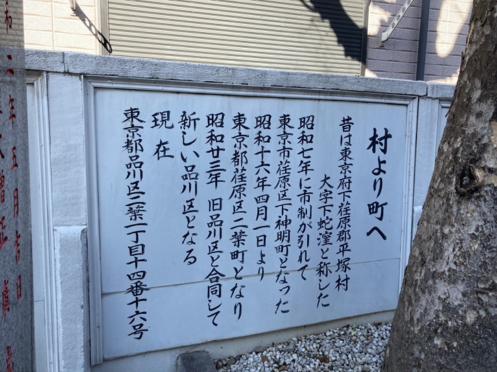 昔は東京府下荏原郡平塚村大字下蛇窪と称した。昭和七年に市制が引れて、東京市荏原区下神明町となった。昭和十六年四月一日より、東京都荏原区二葉町となり、昭和廿三年旧品川区と合同して新しい品川区となる。