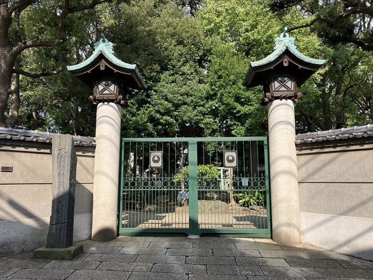 東光寺から養玉院に向かいます。西大井駅の裏手に、立派な門構えの伊藤博文公墓所があります。伊藤博文(1841年〜1909年)は長州藩の下級武士の子として生まれ、幕末期に高杉晋作らと倒幕運動に参加しました。明治維新後は初代内閣総理大臣を務め、明治四十二年にハルビンで暗殺されて国葬が行なわれた後、大井に居館があったことからこの地に葬られました。伊藤門と呼ばれる門柱と門扉は、昭和二十五年に伊藤博文公宅から譲り受けたものです。門柱には、「大勲位伊藤博文公墓所」と刻まれています。