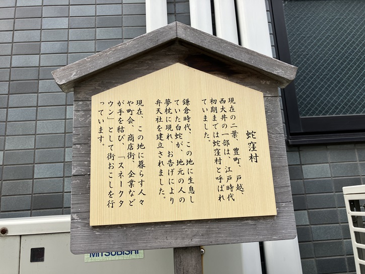 現在の二葉、豊町、戸越、西大井の一部は、江戸時代初期までは蛇窪村と呼ばれていました。鎌倉時代、この地に生息していた白蛇が、地元の人の夢枕に現れ、お告げにより弁天社を建立されました。現在、この地に暮らす人々や町会、商店街、企業などが手を結び、「スネークタウン」として街おこしを行っています。