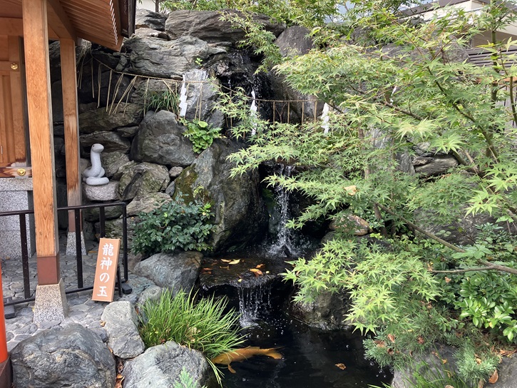 白蛇辨財天の脇には「白龍の滝」と呼ばれる滝があり、そこから流れ出た水路には「夢巳橋」が架かっています。