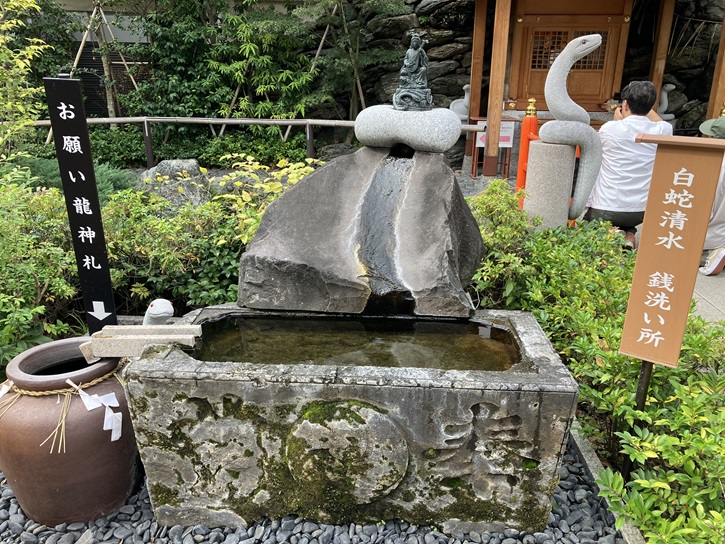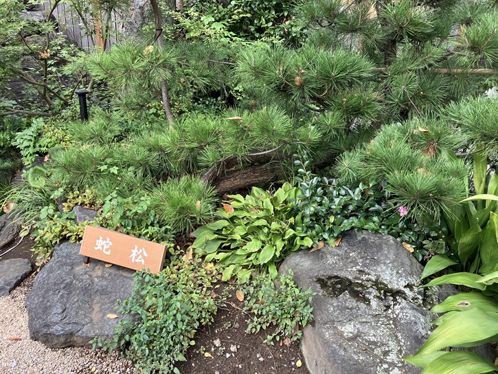 白龍の滝の横には、「蛇松」が植えられています。松葉が繁っていてよく見えませんが、松の木の枝が絡みあって蛇のような恰好をしています。