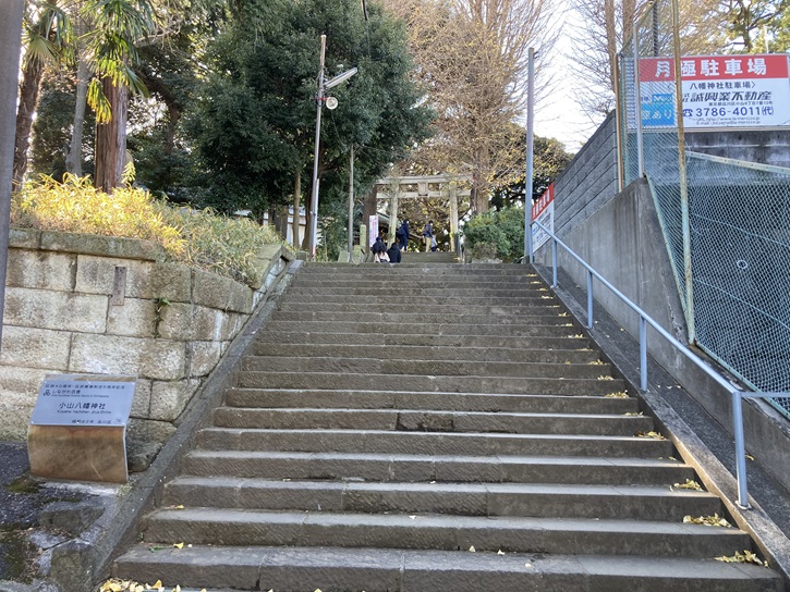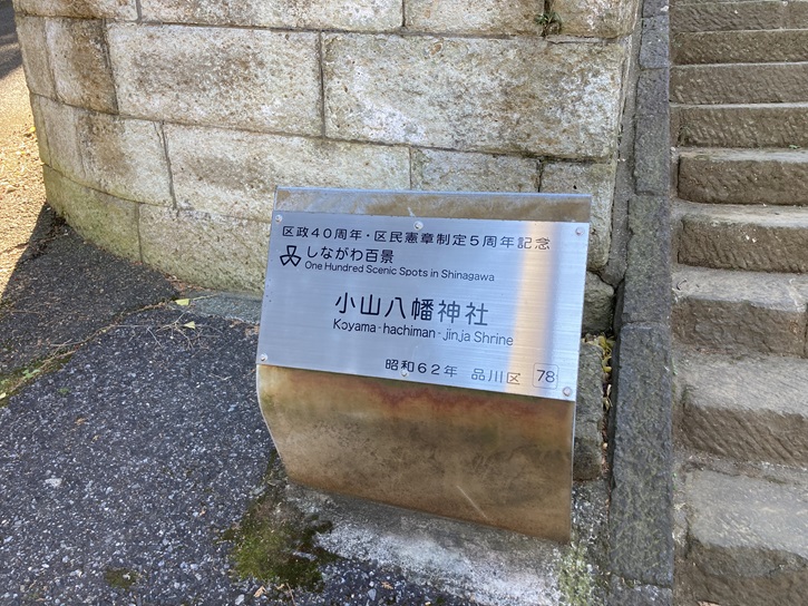 長い参道(ただの道路?)の先に「しながわ百景」にも選ばれている小山八幡神社が鎮座しています。本殿に向かう石段の先にまた石段があり、「小山」の上に社殿が建っているような感じです。実はこの小山八幡神社は品川区内随一の高台にあり、標高は35mにもなります。この地域一帯の土地の名前はこの「小高い山」に因んで「小山」となりました。名前の由来だけではなく、品川区内にはこのような地域一帯を見渡せる場所はなかなかありません。そのため、魅力ある品川区の風景として「しながわ百景」にも選ばれています。