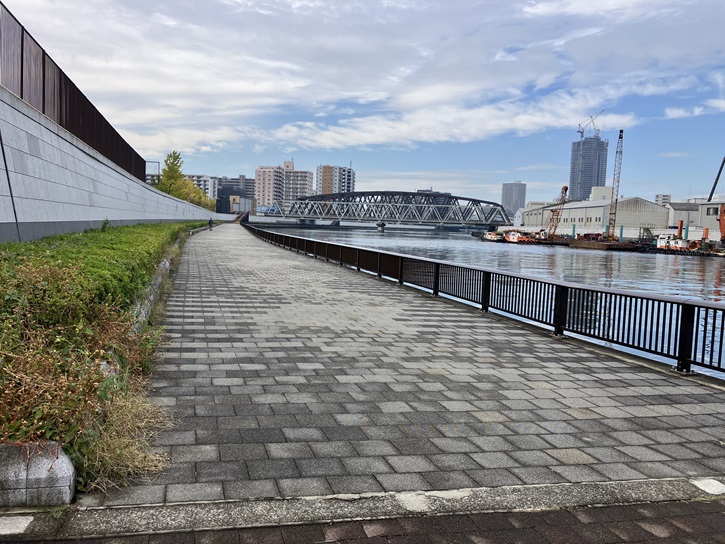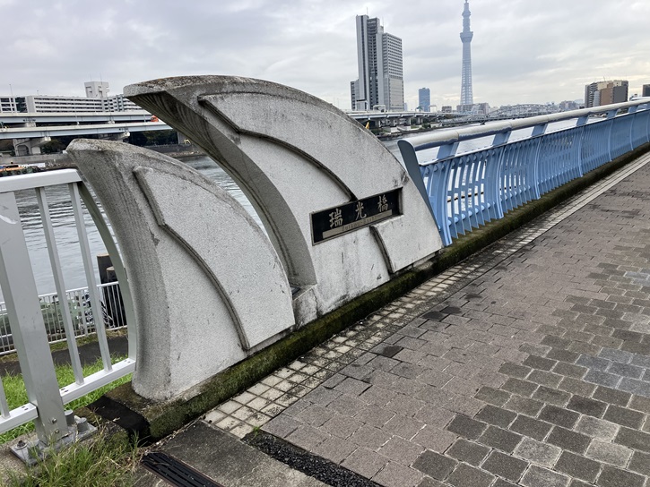 瑞光橋の下を潜ります。といっても、河川敷の遊歩道はこの橋で一旦途切れます。瑞光橋は隅田川に架かる橋でなく、隅田川に通じる入り江に架かる橋なのです。なので、入り江に沿ってぐるりと回り、再び隅田川の遊歩道に入る訳です。