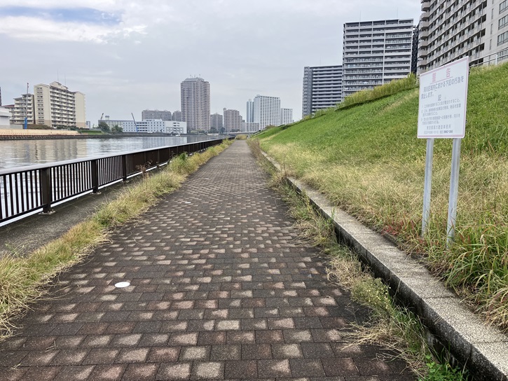 さくら堤通りから土手に上がって遊歩道の始点に向かいます。
