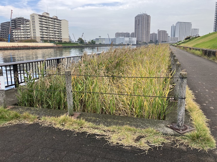 隅田川の川岸と河川敷の遊歩道の間にビオトープが設置されています。ビオトープとは、生物群集の生息空間を示す言葉です。元々はドイツで発祥した生物学の概念ですが、都市化や産業活動によって生物が住みにくくなった場所において、周辺地域から区画して動植物の生息環境を人為的に再構成した環境という意味でも使われています。公園や学校の中にもビオトープを設置しているところが見られます。
