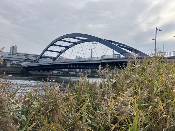 千住汐入大橋の下を潜ります。千住汐入大橋は、隅田川に架かる24番目の橋として、平成十八年2月に開通しました。この場所は、かつて「汐入の渡し」が行き交い、荒川区と足立区を結ぶ交通の要となっていました。汐入の渡しは、現在の千住汐入大橋付近にあり、明治二十三年(1890年)から昭和四十一年(1966年)まで、汐入(現在の荒川区南千住八丁目)と千住曙町の鐘淵紡績会社を結び、女工たちの通勤用として運行されていました。それ以前にも渡しはあったようですが、隅田川で最後まで運行されていた渡しでした。