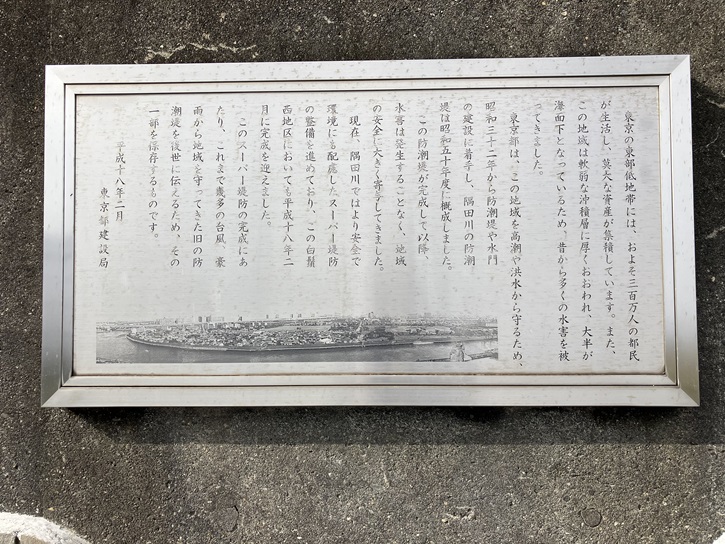 東京の東部低地帯には、およそ三百万人の都民が生活し、莫大な資産が集積しています。また、この地域は軟弱な沖積層に厚くおおわれ、大半が海面下となっているため、昔から多くの水害を被ってきました。東京都は、この地域を高潮や洪水から守るため、昭和三十二年から防潮堤や水門の建設に着手し、隅田川の防潮堤は昭和五十年度に概成しました。この防潮堤が完成して以降、水害は発生することなく、地域の安全に大きく寄与してきました。現在、隅田川ではより安全で環境にも配慮したスーパー堤防の整備を進めており、この白鬚西地区においても平成十八年二月に完成を迎えました。このスーパー堤防の完成にあたり、これまで幾多の台風、豪雨から地域を守ってきた旧の防潮堤を後世に伝えるため、その一部を保存するものです。