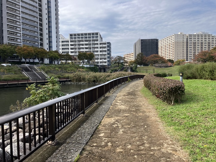 河川敷の遊歩道は行き止まりになり、階段を登って土手上の遊歩道に出ます。ここから先の河川敷には草花が繁茂し、サンクチュアリー区域になっているのだそうです。