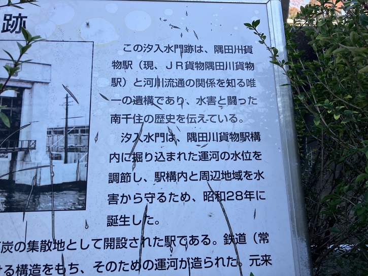 この汐入水門跡は、隅田川貨物駅(現、JR貨物隅田川貨物駅)と河川流通の関係を知る唯一の遺構であり、水害と闘った南千住の歴史を伝えている。汐入水門は、隅田川貨物駅構内に掘り込まれた運河の水位を調節し、駅構内と周辺地域を水害から守るため、昭和二十八年に誕生した。隅田川貨物駅は明治三十年に石炭の集散地として開設された駅である。鉄道(常磐線)と隅田川の水運を結びつける構造をもち、そのための運河が造られた。元来この地域は土地が低く、運河の護岸は荷物の揚げ下ろしの関係上、低く造られていたため、満潮時には付近に浸水し、さらに台風などの異常な高潮時には南千住ばかりでなく、浅草方面まで被害をこうむっていた。水門は、この水害を防ぐために建造されたのである。しかし貨物の輸送が船による河川輸送から鉄道・トラックによるコンテナ輸送に切り替わると、運河は不用となり昭和四十五年頃には全て埋め立てられ、水門もその役割を終えた。