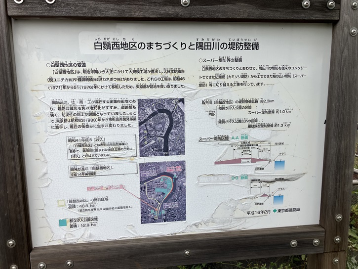 白鬚西地区の再開発の歴史と隅田川の堤防整備について案内板が立っています。汐入公園は工場跡地に造られたんですね。