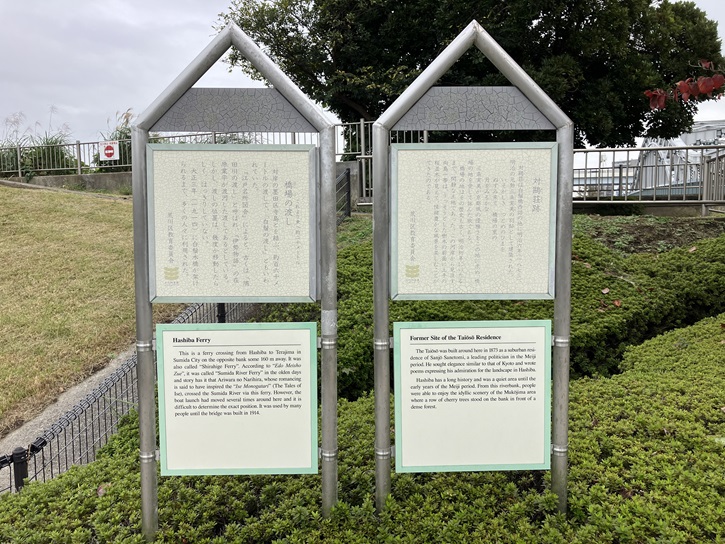 隅田川の土手の植え込みの中に、ふたつの案内板が立っています。