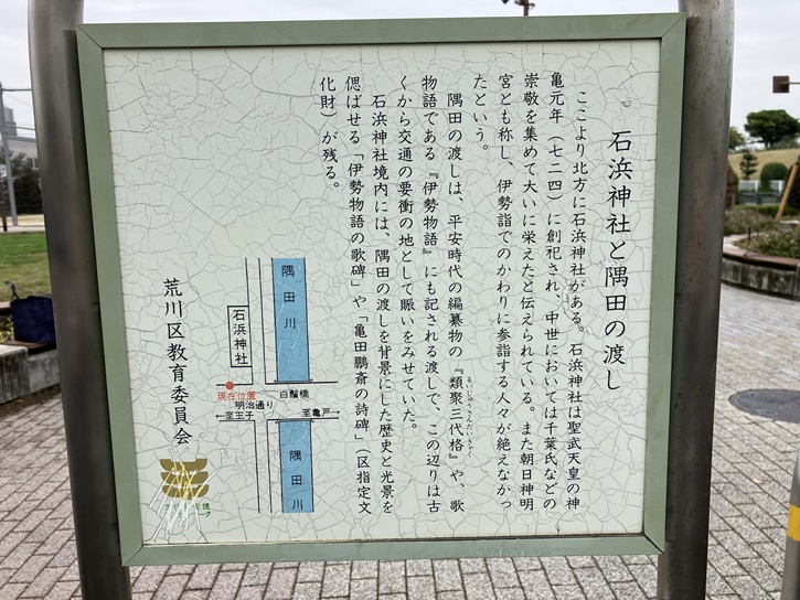 ここより北方に石浜神社がある。石浜神社は聖武天皇の神亀元年(724年)に創祀され、中世においては千葉氏などの崇敬を集めて大いに栄えたと伝えられている。また朝日神明宮とも称し、伊勢詣でのかわりに参詣する人々が絶えなかったという。隅田の渡しは、平安時代の編纂物の「類聚三代格」や、歌物語である「伊勢物語」にも記される渡しで、この辺りは古くから交通の要衝の地として賑いをみせていた。石浜神社境内には、隅田の渡しを背景にした歴史と光景を偲ばせる「伊勢物語の歌碑」や「亀田鵬斎の詩碑」(区指定文化財)が残る。