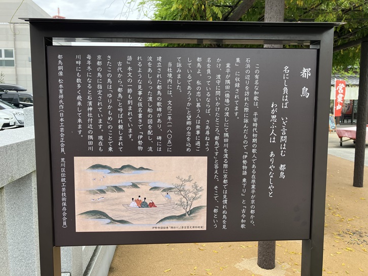 この有名な和歌は、平安時代初期の歌人である在原業平が京の都から、石浜の辺りを訪れた際に詠んだもので「伊勢物語 東下り」と「古今和歌集」に収録されて(い)ます。業平が隅田(橋場)の渡しにて隅田川を渡る際に京都では見慣れぬ鳥を見かけ、渡守に問いかけたところ「都鳥です」と答えた。そこで、「都という名を負っているならば、さあ尋ねよう都鳥よ。私の恋い慕う人は無事に過ごしているであろうか」と望郷の念を込めて詠みました。当社境内には、文化二年(1805年)に建立された都鳥の歌碑があり、碑には波をあしらった渡し船の図を配し、流