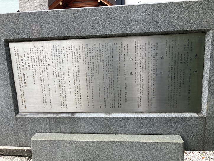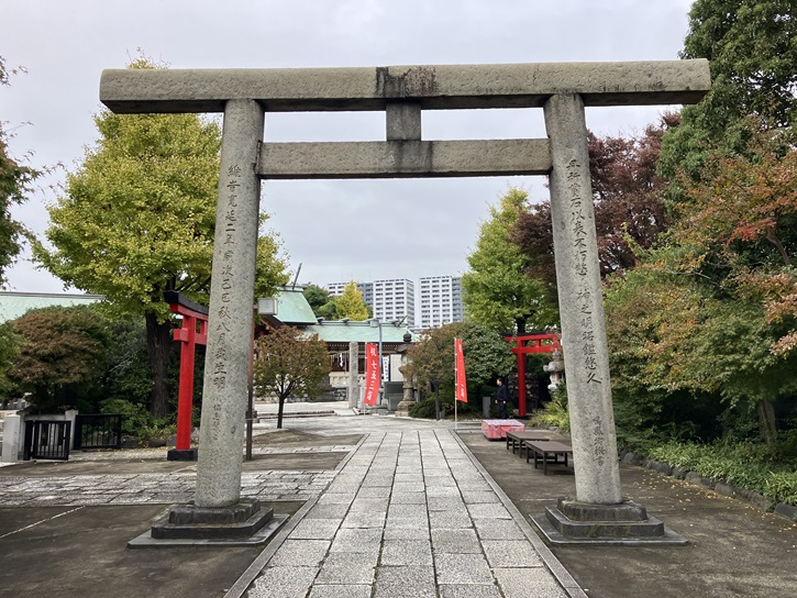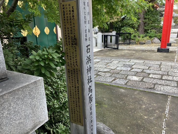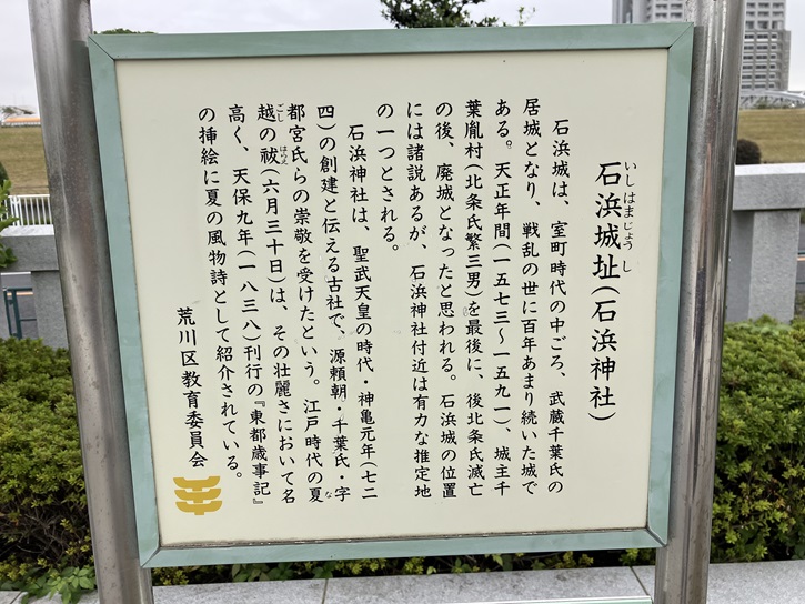 石浜神社は神亀元年(724年)に創建され、隅田川の西岸(石浜と呼ばれた長く伸びる微高地)に鎮座しています。源頼朝が奥州征討の折に戦勝を祈願し、また元寇の際には朝廷から鎌倉幕府七代将軍・惟康親王を勅使として戦勝を祈願させました。いずれの戦役にも勝利したことから、中世以降は関東武士を始め多くの人々の崇敬を集めることになりました。この地域には中世の鎌倉・南北朝時代から安土桃山時代頃にかけて石浜城が存在し、石浜神社付近が城跡候補地のひとつとされていて、東京都の遺跡地図上では石浜神社北側が埋蔵文化財包蔵地となっています。