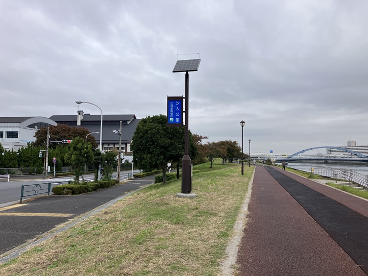 石浜神社を出て、隅田川の遊歩道に戻ります。復路は河川敷ではなく、土手上の遊歩道を歩きます。瑞光橋を渡った先から汐入公園に入ります。