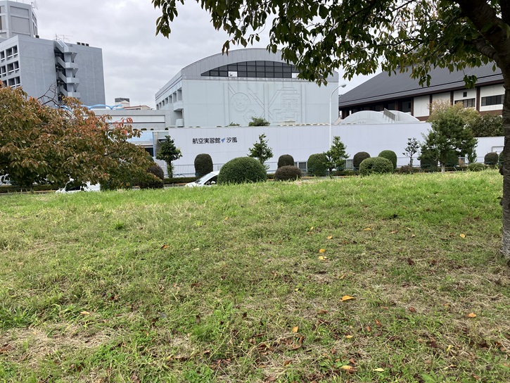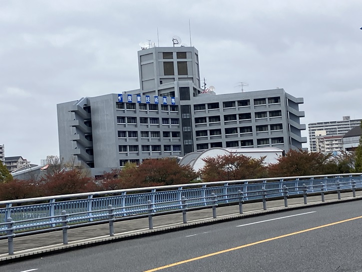 左手には、屋上にパラボラアンテナが据えられた特徴的な外観の産業技術高専の校舎が聳えています。汐入に荒川キャンパスがある東京都立産業技術高等専門学校は、都立工業高等専門学校と都立航空工業高等専門学校の統合により、平成十八年(2006年)4月に設置されました。都立大学工学部と同じく、府立電機工業学校を源流に持ち、また前身校の工業高等専門学校と航空工業高等専門学校は最初期に設立された14の高専のうちの2つであり、高等専門学校としても長い歴史を持っています。開校と同時に5年制の本科(準学士課程)の上に2年制の専攻科(学士課程)が設置され、本科学生数1、607人、専攻科学生数79人の計1、686人の学生がものづくり教育を受けています。「航空実習館 汐風」は、汐風を受けて大空にはばたくイメージを基に命名された建物です。